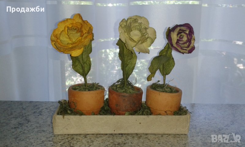 Красив орнамент за Вашия дом- 3 саксийки с истински сушени цветя- розички. Размери: д. около 5 см.; ш. около 4.5 см; в. около 12 см.