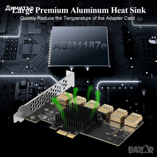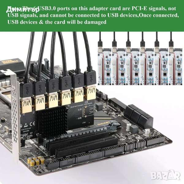 Адаптер служи като сплитер от 1 PCI-E към6 PCI-E с USB. Позлатени конектори.