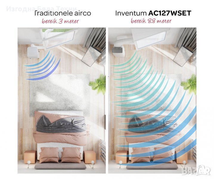 Ние доставяме AC127WSET с комплект с висока производителност. С този комплект устройството достига по-ниска температура от традиционния мобилен климатик. Топлият въздух отвътре се изхвърля навън, а новият въздух идва охладен отвън. Този климатик осигурява максимално охлаждане в къщата. Благодарение на мощния вентилатор с функция за люлеене 80⁰, устройството има голям обхват до 8,8 метра.