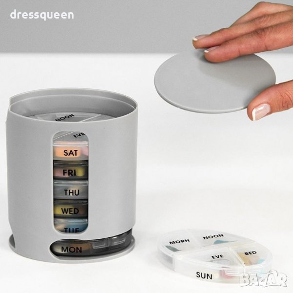 Той съдържа седем подвижни кутийки, по една за всеки ден. Всяка кутийка е обозначена за съиюответния ден и има отделения за различното време на деня - сутрин, вечер или преди лягане. Просто разпределете медикаментите за цялата седмица и всеки ден вземайте определената кутийка.