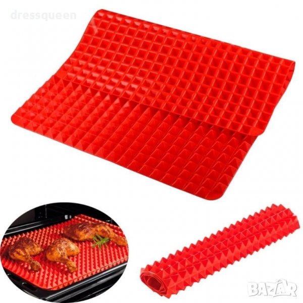 Донесете радостта от печене във Вашия дом със силиконовата подложка за печене на ястия Pyramid Pan, с която ще направи вашите кулинарни специалитети хит в корема на всички! За разлика от обикновените подложки за печене, Pyramid Pan е направена от над 500 незалепващи силиконови пирамидки, които позволяват на въздуха да циркулира под и около храната за равномерно разпределение на топлината, намаляват необходимостта от често обръщане, а излишната мазнина се оттича в каналчетата. Така храната излиза хрупкава, сочна и здравословна, а тавата е лесна за почистване. Храната вече никога няма да прегаря или да плува в мазнина. Слагайте престилката около кръста си, защото е време, за приготвяне на вкусни рецепти с помощта на подложката Pyramid Pan!