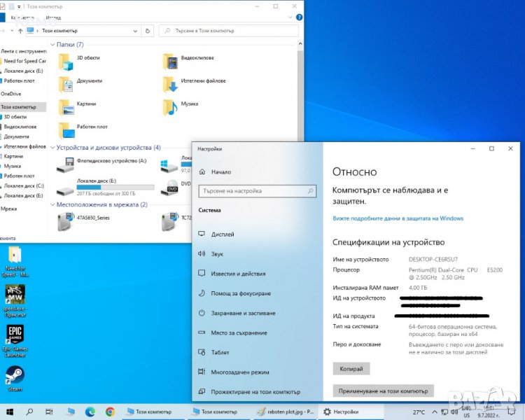 Инсталиран Windows 10 с поставени необходимите програми за нормална работа. Както и някои игри които се виждат на десктопа. Даваме го заедно с клавиатурата, мишка и захранващ кабел. Хард диск нямаше за това е закупен чисто нов преди да го пуснем за продажба.
