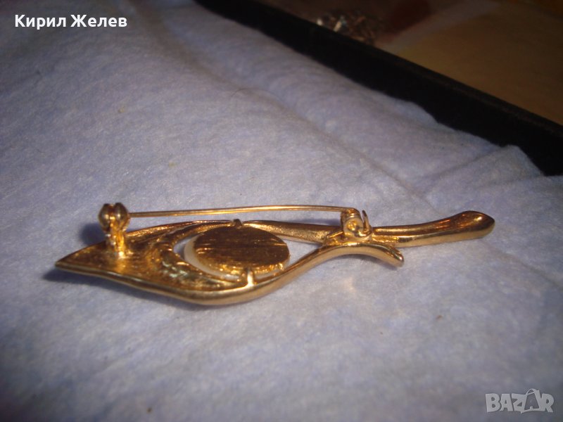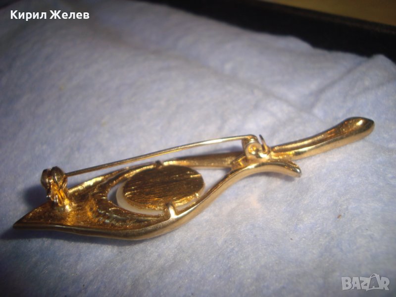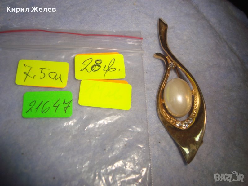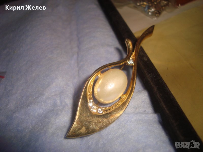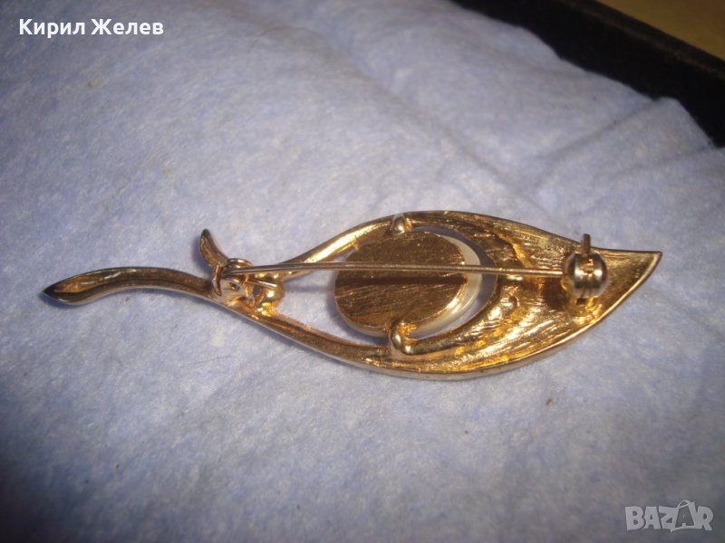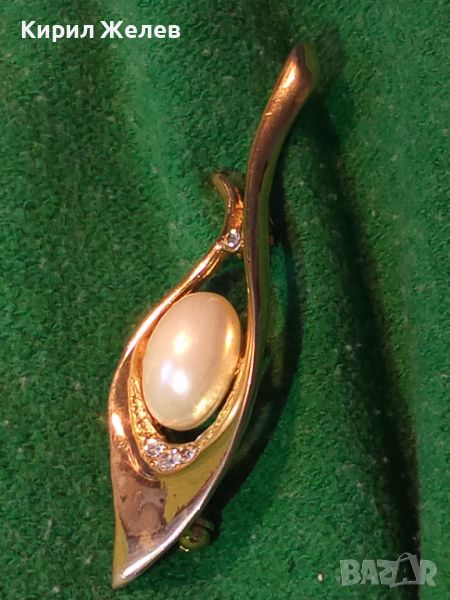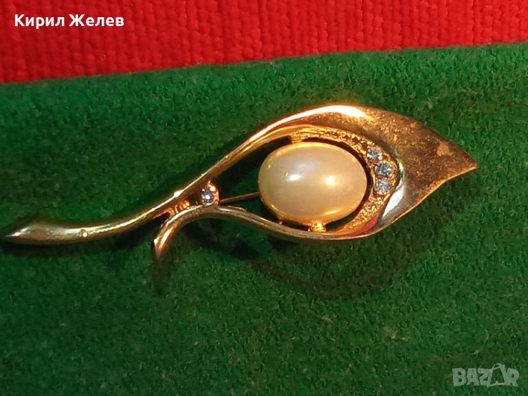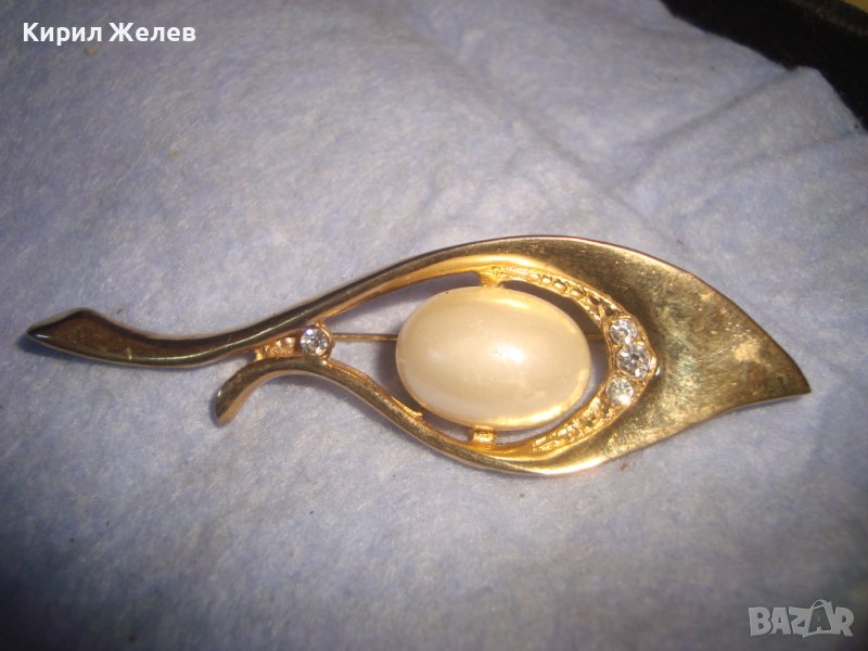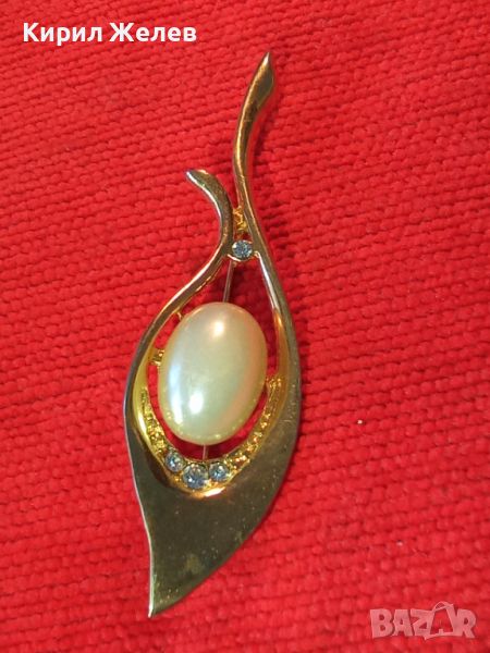 КРАСИВА ЕЛЕГАНТНА ЛИСТОВИДНА АРТ ДЕКО ПОЗЛАТЕНА ПЕРЛЕНА ВИНТИДЖ БРОШКА с ЦИРКОНИ 21647
