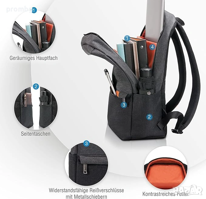 бизнес раница за лаптоп до 39,6 см (15,6”), Еverki, Германия. Цвят - черен със сиво. Размери: Дълбочина 120 мм; Височина 465 мм; обем 23л; Ширина 340 мм; Тегло 0,70 кг. Раница за лаптоп за мъже и жени, подходяща за лаптопи до 15,6 инча. Допълнителна защита от надраскване благодарение на филцова подплата в отделението за лаптоп и таблет.