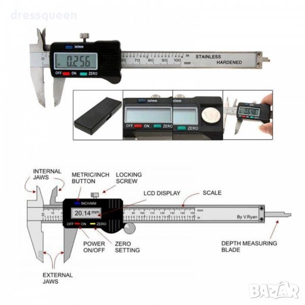 Шублерът е с голям LCD екран извеждащ резултатите. Диапазонът на измерване е 150 мм. Оборудван е с ключ за зануляване, включване и изключване. Измерване на дълбочина. Можете да измервате външни и вътрешни размери и дълбочини много лесно