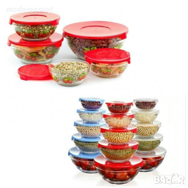 Комплекта съдържа 5 стъклени купи с пластмасови капаци. Капаците на купите се предлагат в различни цветове - червено, синьо, жълто и лилаво. Цветовия подбор е на случаен принцип. Ако желаете конкретен цвят моля напишете вашето желание в полето за допълнителен коментар при финализиране на поръчката.