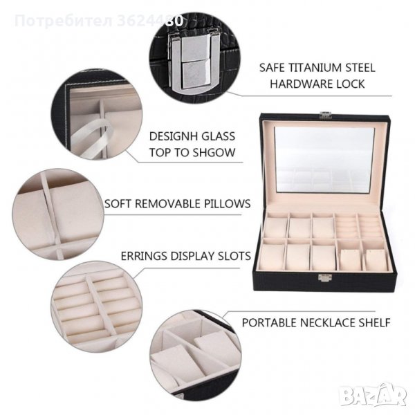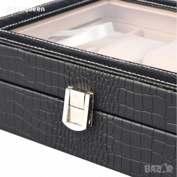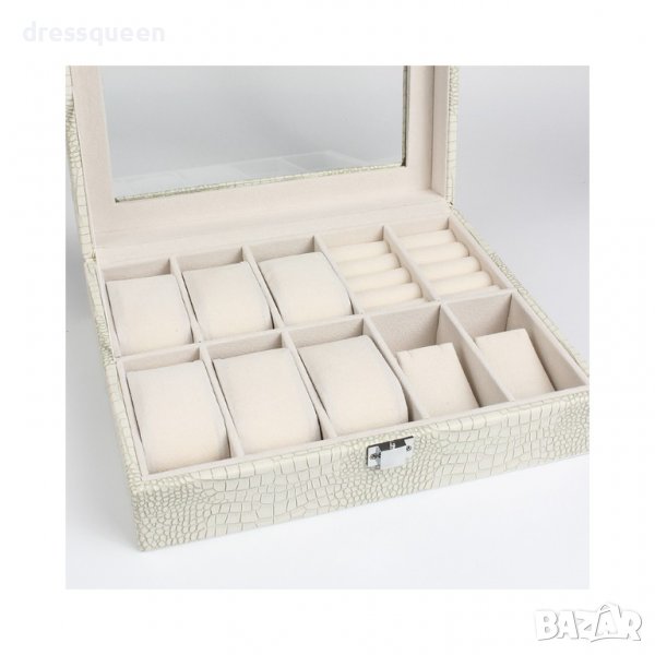 Органайзер-кутия, направен с внимание към детайла, красиво представя показва съдържанието му. Продуктът е изработен от еко кожа с контрастен интериор. Капакът на кутията е прозрачен, така че кутията за часовници и бижута може да се използва не само за съхраняване и поддържане на реда, но и за елегантно показване на съдържанието.