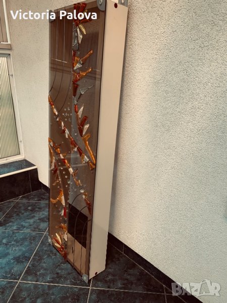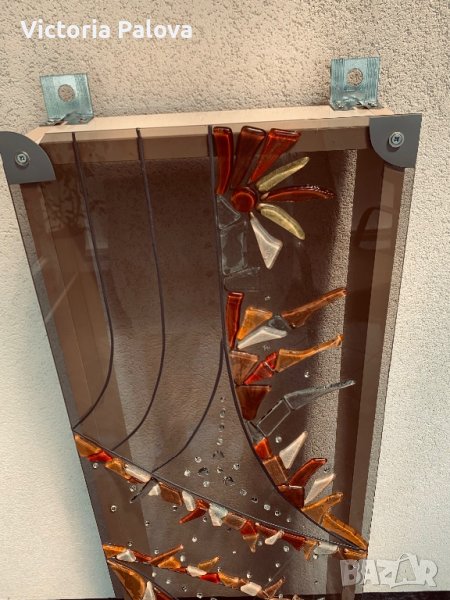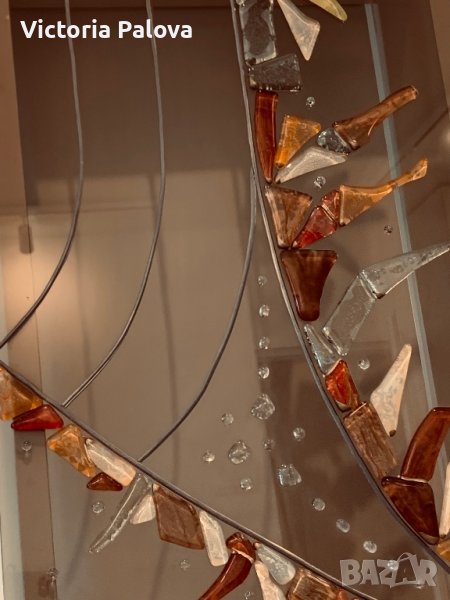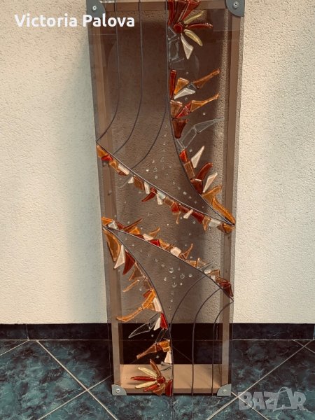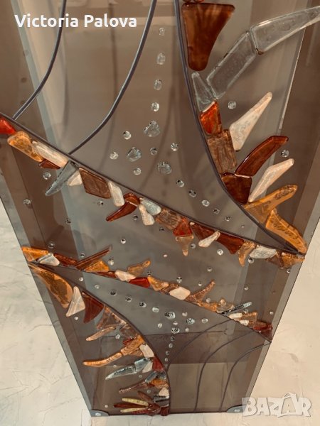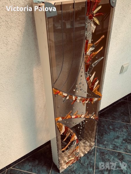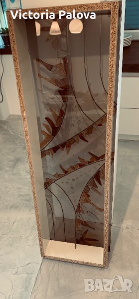 Ръчно изработено пано от стъклени речни камъни,подходящо за ниша,стена -може да се окачи-или върху ниска мебел,отвътре може да се сложат лампи или новогодишни малки лампички-свети необикновено,загадъчно и много красиво.височина на “шкафа” е 110см,широчината е 35см,дълбочина-10см.цветът на стъклото е кафяв.
