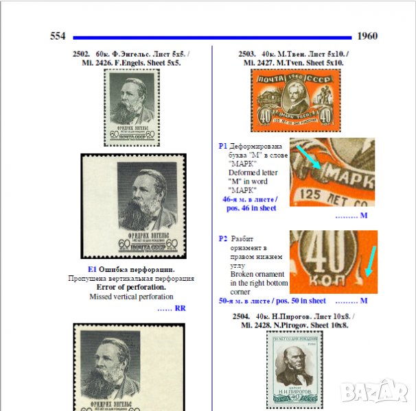 Основното съдържание на каталозите е разнообразие от пощенски марки в резултат на различни дефекти в клишетата на печатната платка.Дефектите на клишето включват различни дефекти на детайлите на шаблона на клишето,износване на клишето, както и залепване на съсиреци от типографски бои.