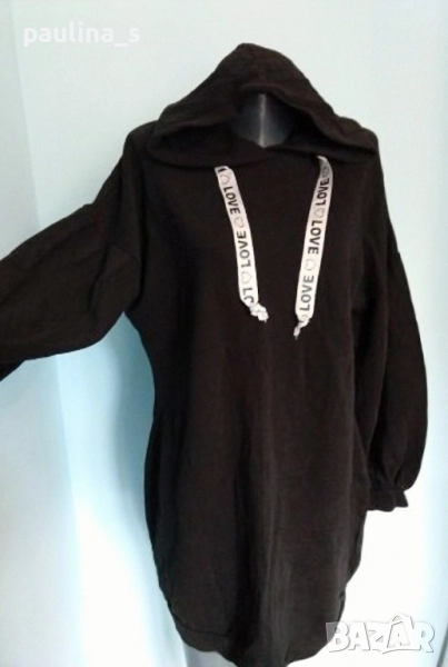 2️⃣. 2XL / 4XL / Цената е крайна, без пазарлъци 44,99лв / 22,5 евро. Ватирана рокля тип туника туника с качулка, топла и подходяща за сезон есен - зима - пролет. Материята е ватирано памучно трико, има еластичност и покрива няколко размера. Моделът е обран и леко втален, ръкавите са падащи и в лек набор в горната част. Нова без етикет, една бройка е.