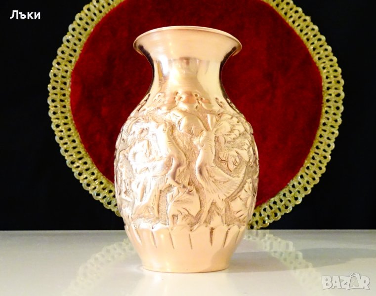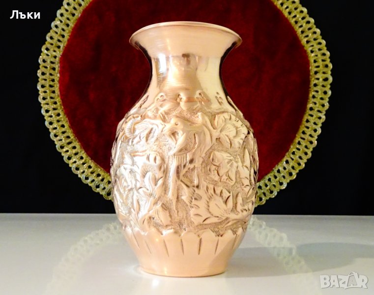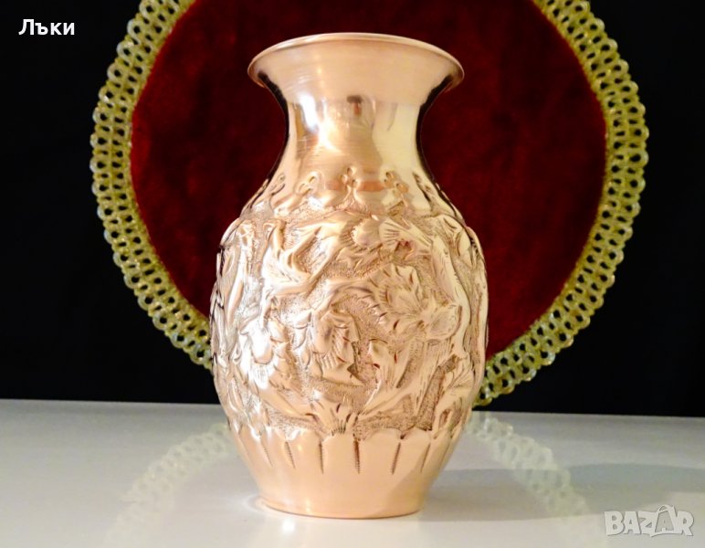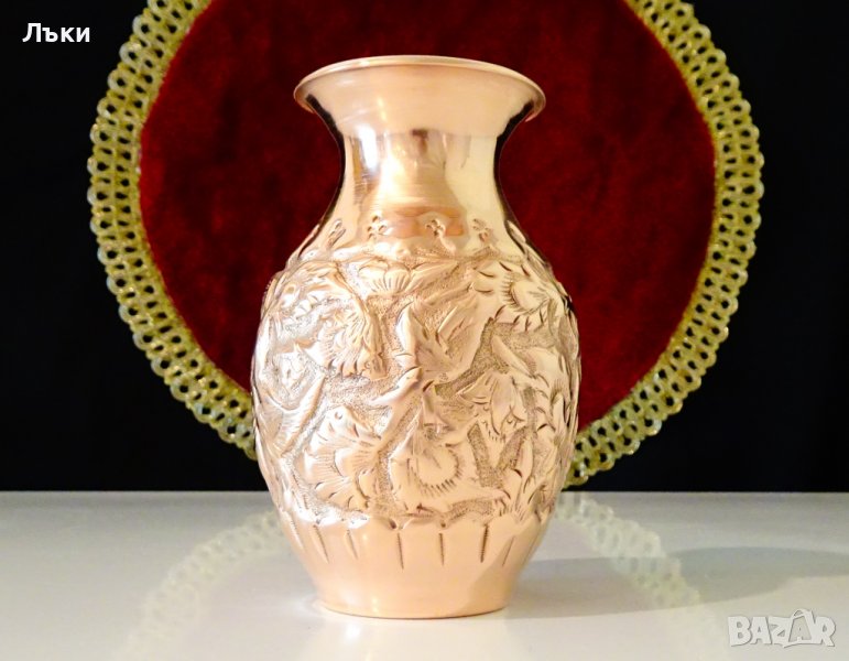 Старинна ръчно кована медна ваза,кана за ракия,гарафа, Исфахан с изключително красива релефна картина на птици сред разцъфнали цветя.Вазата е представител на древното изкуство възникнало преди 3000 години в столицата на Персия Isfahan,наречено Qalamzani или Ghalam zani.Каламзани