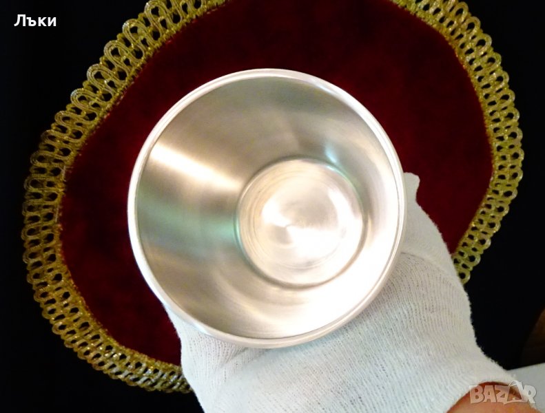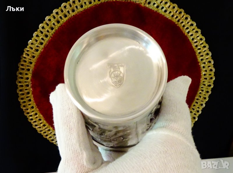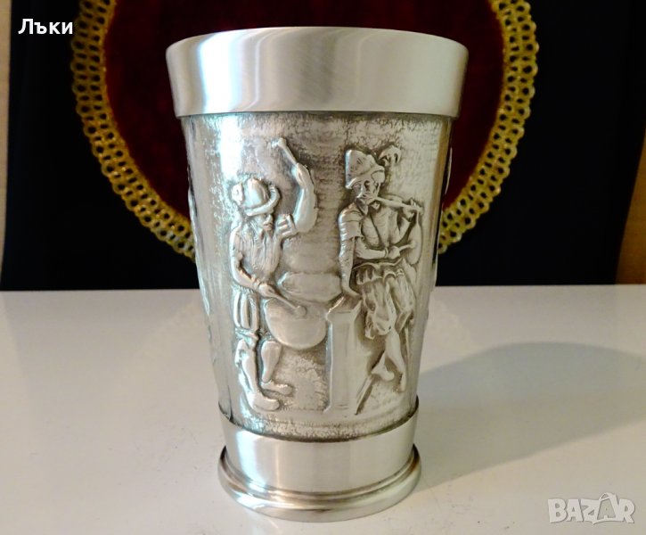 качество.Декорирана с релефни картини Мускетар и музиканти.Изключително качество и масивност със сребърен блясък.Височина 12 см.,диаметър 8 см.,тегло