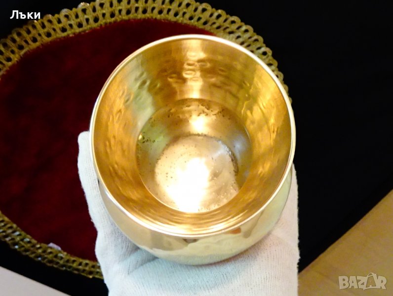масивен бронз със златен блясък и релефна декорация.Височина 13 см.,диаметър 10 см.,тегло 270 гр.Вместимост 500 мл.