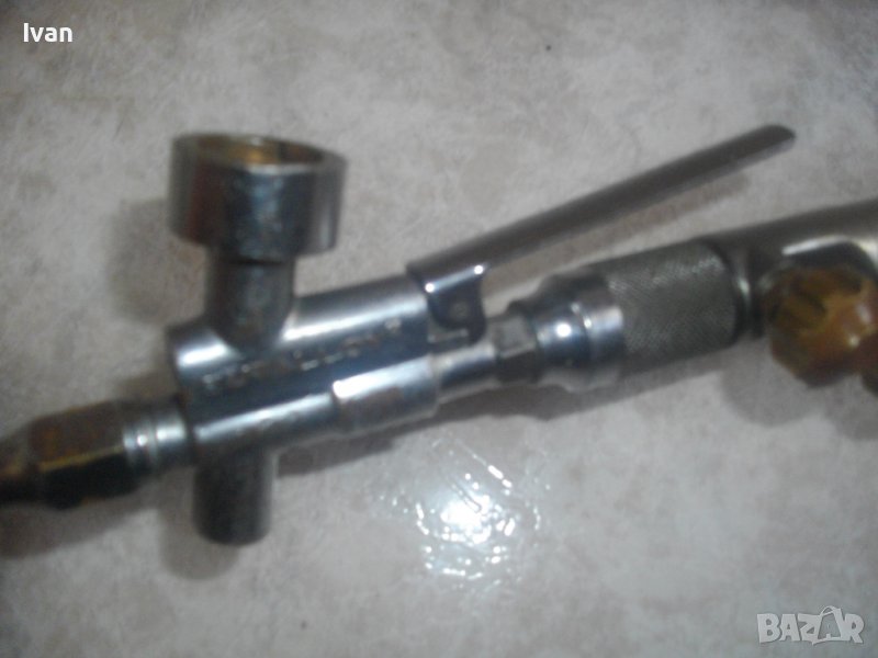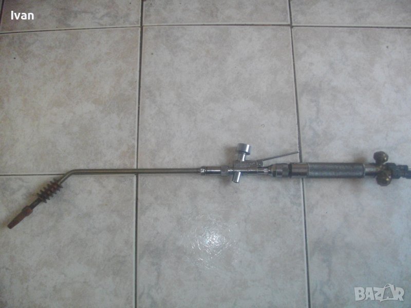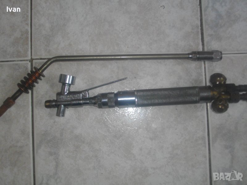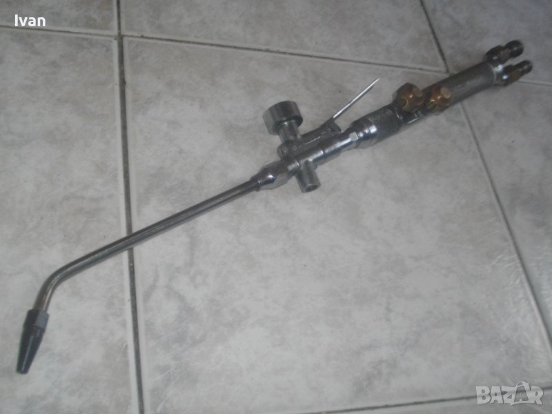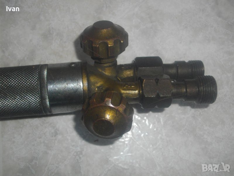 Масивна стоманена дръжка от инокс неръждавейка, 2 въртока/врътки от бронз, бронзови щуцери, 2 извода отзад, стомана предна част глава8тяло, оловно-цинкова тръба с медна контактна дюза с 1 голям отвор. Тръбата над контактната дюза е с медно оребряване /холендър/ против разширяване на тръбата при работа с висока температура. Резака е почти нов, много малко използван.Serial Number E 1333.
