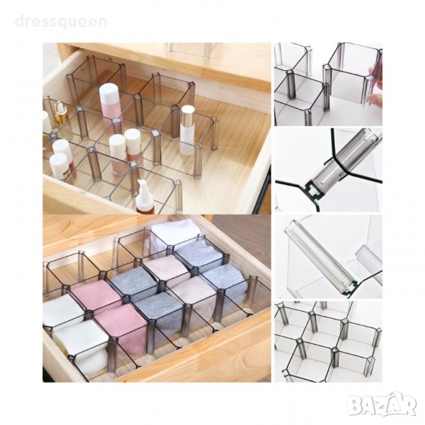 Органайзер за шкаф или чекмедже състоящ се от 6 квадратни отделения, съединяващи се едно за друго, по ваше желание. Органайзер за чорапи, бельо и др. дребни аксесоари, който ще внесе ред по гардеробите и шкафовете. Практичен и удобен
