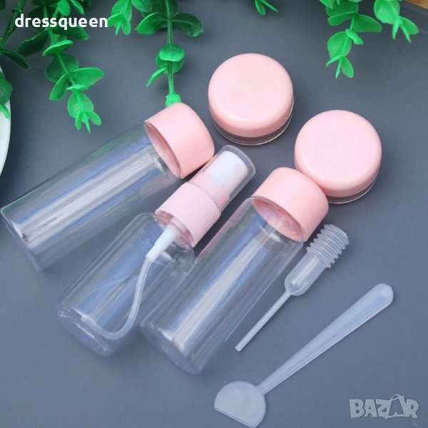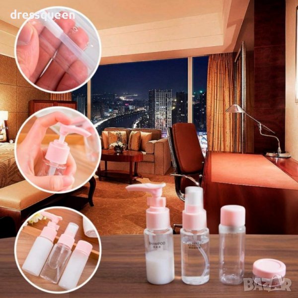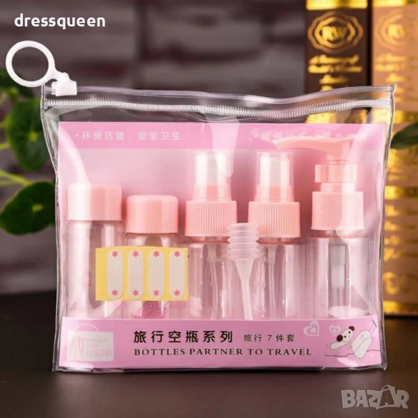 Козметичен комплект, който ще направи пътуването ви по-приятно, защото ще ви улесни страхотно при приготвянето на багажа! Комплектът съдържа 5 броя малки шишенца 50 мл. и малка кутийка, в които да отсипете от най-необходимите козметични продукти - шампоан, балсам, лосион за тяло, крем за лице и др.