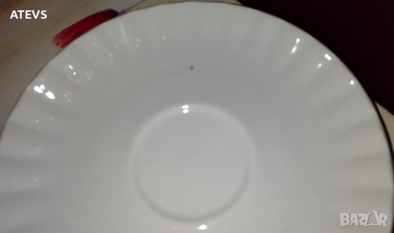 чашката и лека драскотина на десертната чиния. Всичко е с маркировка. Десертна чиния - диаметър 19 см, подложна чиния – 14,3 см, чаша – вместимост 180 мл,