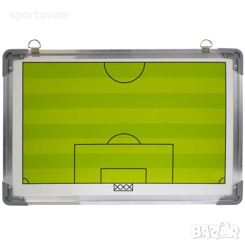 Магнитна треньорска дъска за футбол. Предназначена за учители и треньори по време на тренировки и мачове. За нагледно представяне на тактиката и съставяне на стратегия за защита или атака на отбора, и за разпределение на играчите по терена. Дъската има две страни – едната е със схема на цяло футболно игрище, а другата е с половин терен в по-едър мащаб. В комплекта са включени магнити за по-добро онагледяване на игровата ситуация, два маркера и гъбичка. ВНИМАНИЕ! Не пишете с перманентен маркер! Дъската разполага с кукички за закачане на стена. Размери - 45х30х2 см. Тегло - 620 г.