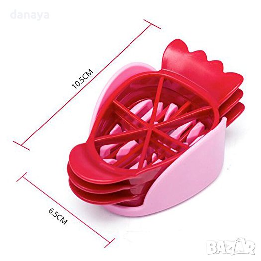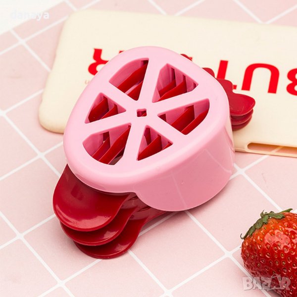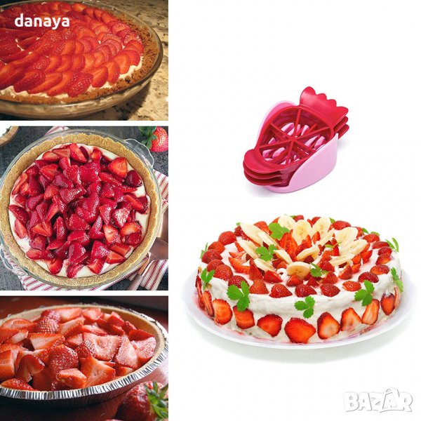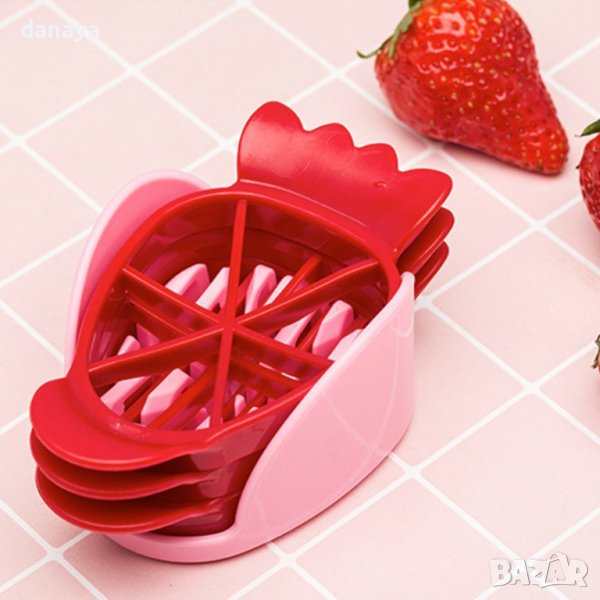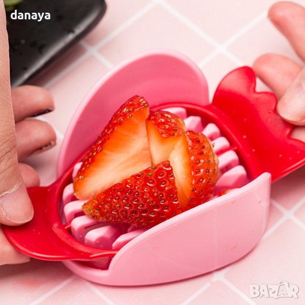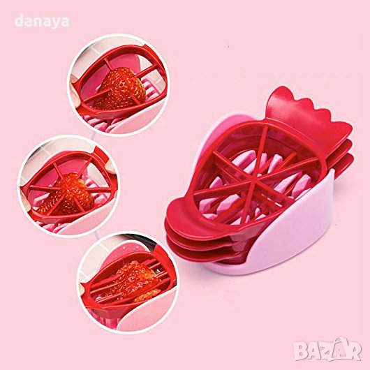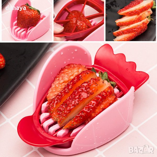 Уред за рязане на ягоди с 3 различни приставки. Чудесен кухненски аксесоар, с който ще нарежете ягоди, киви, банани или твърдо сварени яйца на еднакви парченца. Приборът е идеален за изрязване на парченца плодове с еднаква форма за декорация на торти или сладкиши. С него се работи лесно и бързо.