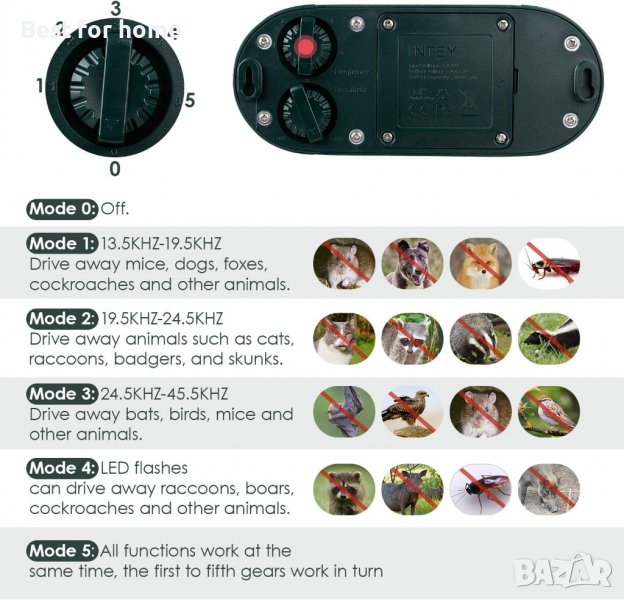За отблъскване на всички видове животни и птици- срещу мишки, лисици, куници, котка, куче, миеща мечка, язовец, прилепи, птици, мишки, миеща мечка, глиган, куница и др.