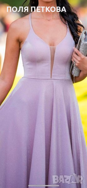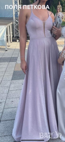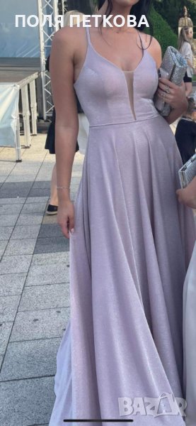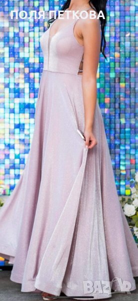Роклята е размер m но материята е еластична пада много леко и свободно отзад е със регулиращи се презрамки цвета е бледо розово с леко сребро в него роклята е лека и удобна обличана е за два часа