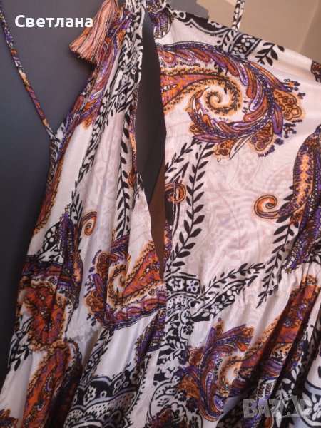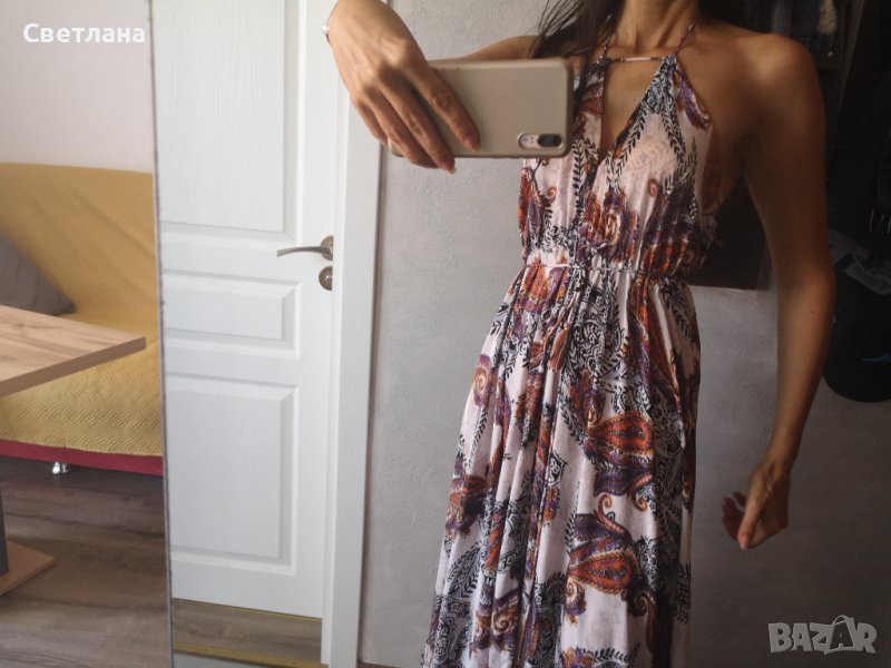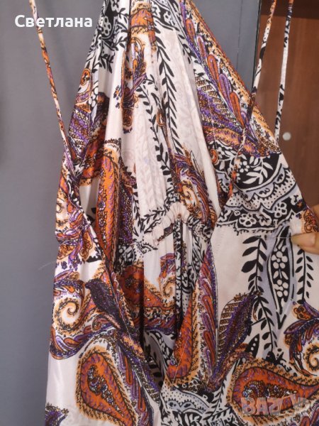 Нова рокля от естествена коприна. Може да се носи от S до XL. Модела е свободен и се регулира с връзки. Има страхотен гол гръб.
