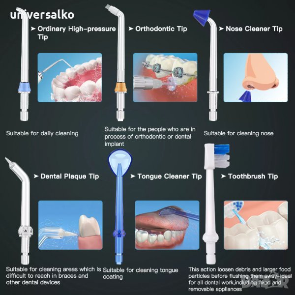 Електрическия душ за зъби, предлага 8 броя мултифункционални струйни накрайника за поддържането на вашата перфектна дентална хигиена. Тези 8 броя сменяеми глави са с възможност за въртене на 360°, което помага за по-доброто почистване на зъбите, дори и на най-трудно достъпните места.