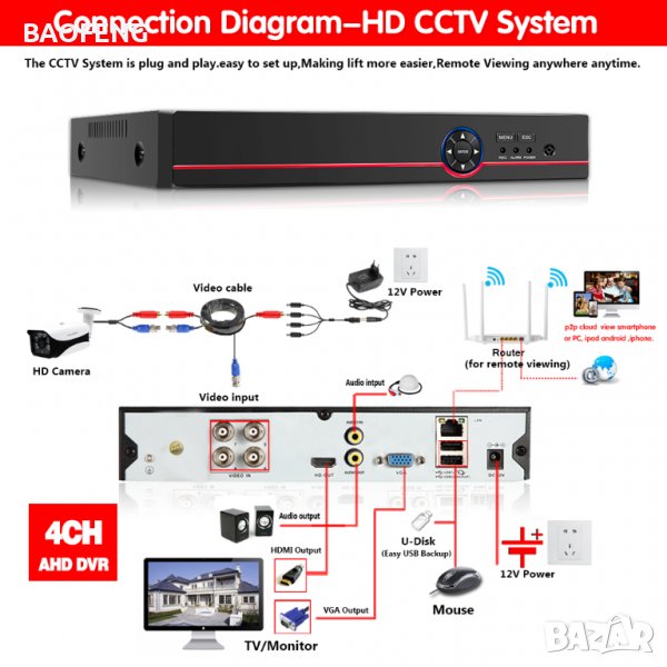 - DVR 4-канален - VGA изход, HDMI изход, 2бр. USB входове