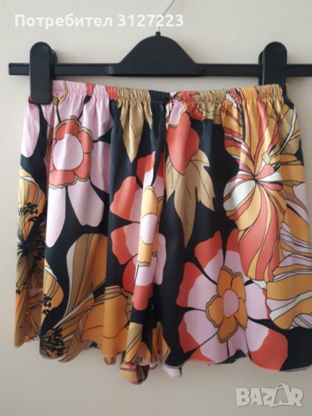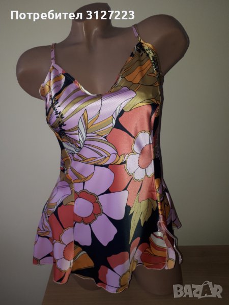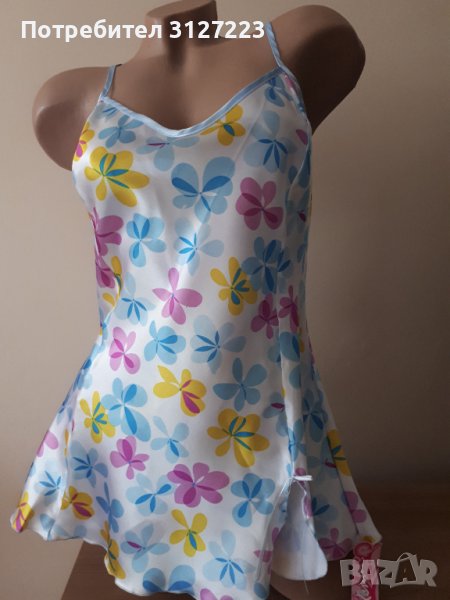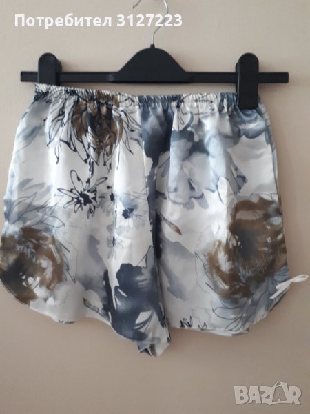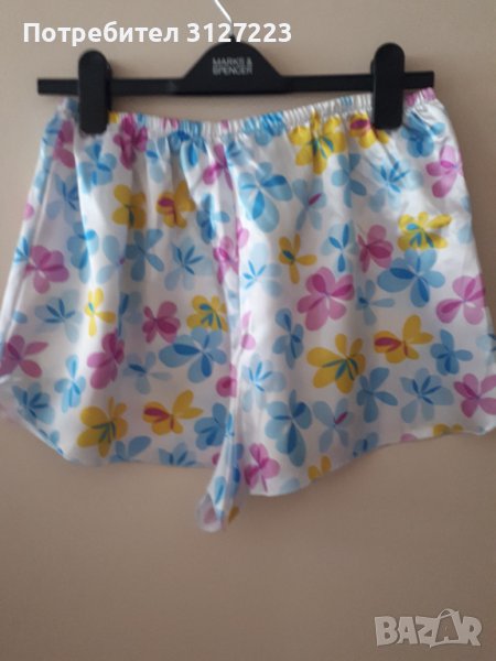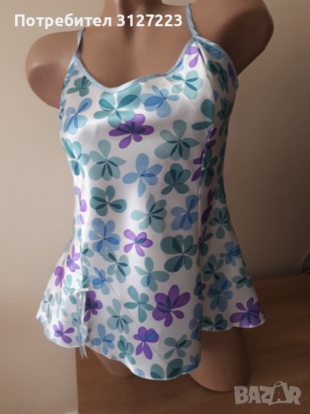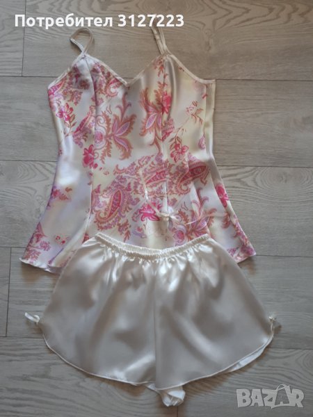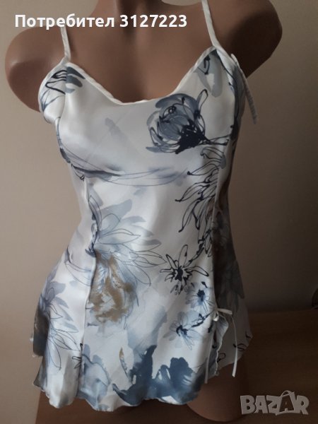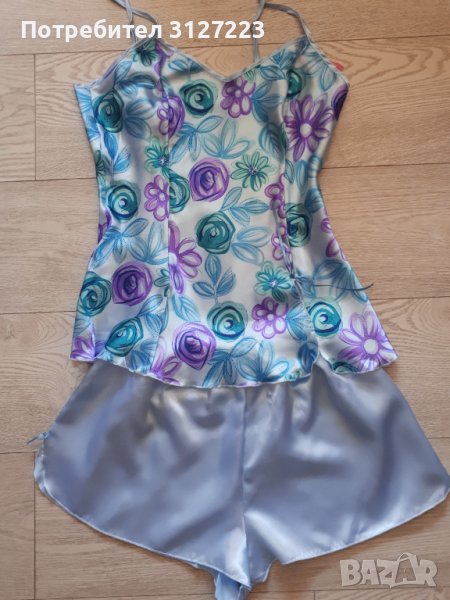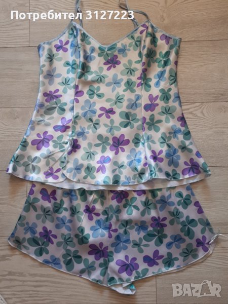 Пижамата е с потник с тънки регулируеми презрамки и къси панталони.