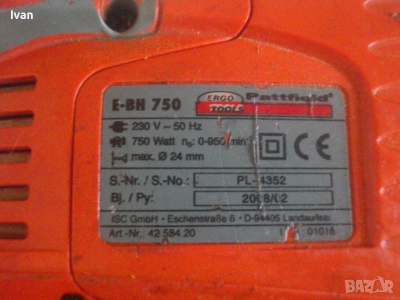 ОПИСАНИЕ НА оранжев 750 вата Патфийлд. 3 позиционен среден клас, перфоратор - къртач. Машината се предлага ЗА РЕМОНТ - НЯКОЙ ДА СИ Я ОПРАВИ, ИЛИ ЗА ЧАСТИ - САМО ЦЯЛА, НЕ СЕ ВАДЯТ ЧАСТИ ОТ НЕЯ. Марка и модел на перфоратора - Pattfield E-BH 750. Производство - 2008 г - държава производител не е упомената, надписите са на немски. МАШИНАТА РАБОТИ СИЛНО И МОЩНО, ВДИГА ОБОРОТИ, НЯМА ИСКРЕНЕ, НО НЕ ВЪРТИ ПАТРОННИКА ПРИ ФУНКЦИЯ ПРОБИВАНЕ. Запазен външен вид, техн.състояние - описаното по-горе - мотора работи добре, не върти патронник. Мощност на мотора 750 вата, обороти - 0-950 об./мин, регулируеми с регулатор на спусъка. Патронник - тип SDS Plus- захват макс до 24 мм, при пробиване. Реверс смяна посока - работещ. Автостоп на спусъка - работещ. Функции- позициониране - 3 бр. - пробиване, къртене, комбинирана.Стоманена редукторна кутия. Кабела е внаждан.