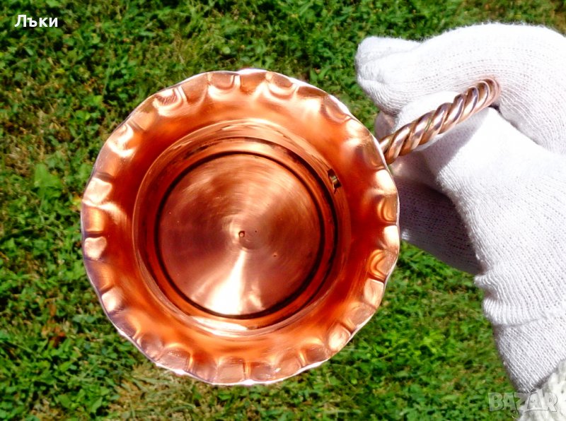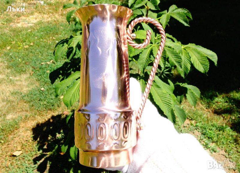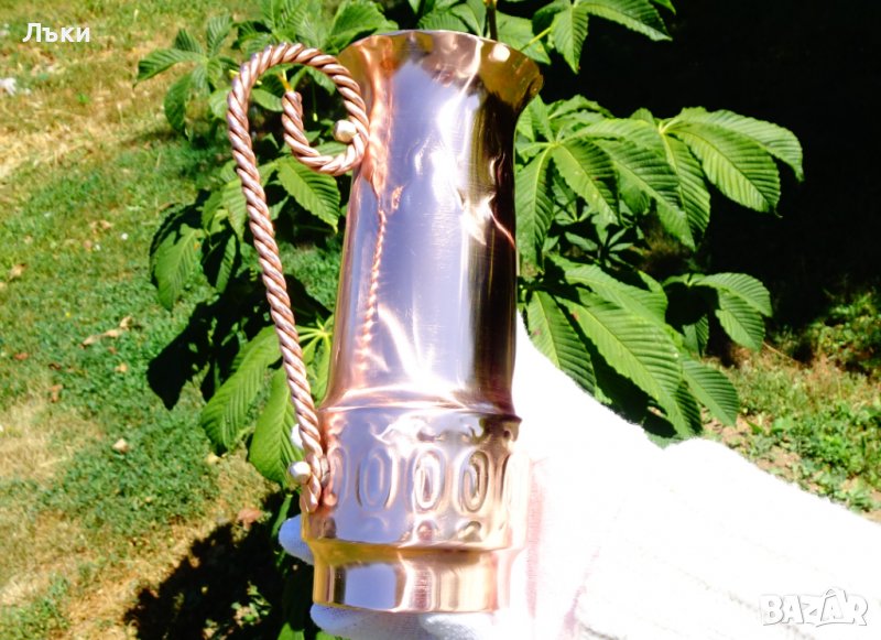 Старинна белгийска кана,халба, от чиста червена мед,изключително красива майсторска изработка с релефно кована декорация и дръжка от плетена мед.Еталон за качество с ослепителен червен блясък.Вътре не е калайдисана.Височина 18
