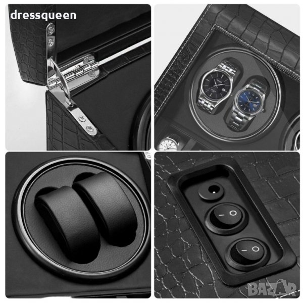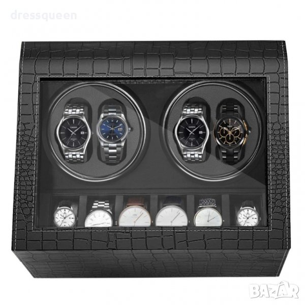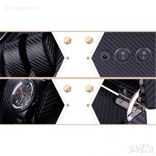 кутия за навиване на 4 автоматични часовника едновременно и съхраняване на още 6 класически часовника. Перфектна изработка от черен карбон отвътре и отвън със закалено стъкло на капака.