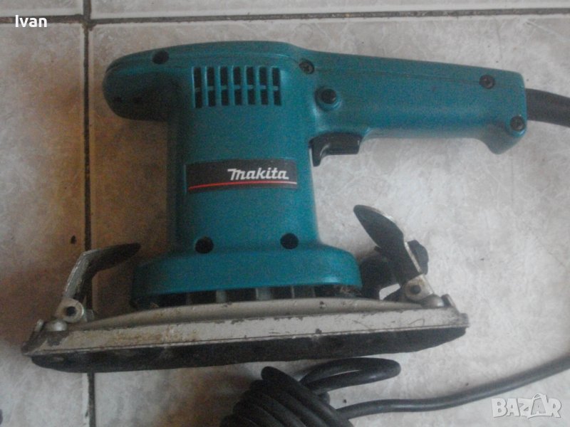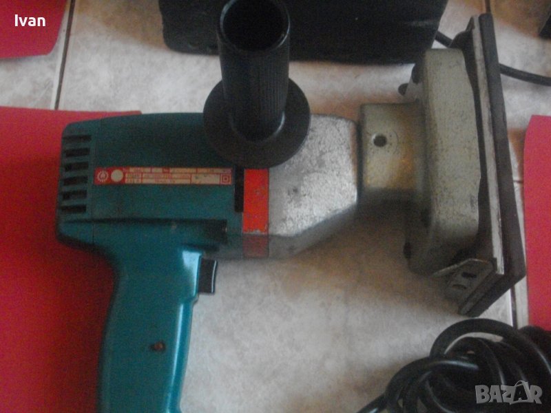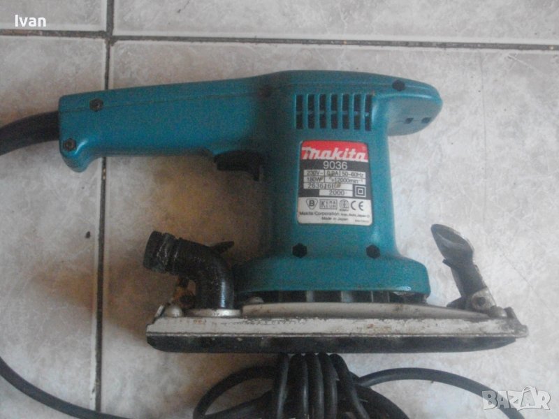 Makita 9036. Производство - оригинално Япония - Japan, вписано на маркировките. Отлично техн. състояние и запазен външен вид. Мощност на мотора - 180 вата ,обороти - 12 000 в минута ,постоянни.Плот масивен алуминиев, с две странични широки щипки за захват на шкурката. Инпрегнирана гума под плота за обиране нва вибрациите. Наличие на отведждащ конектор на отпадъчна прах с вграден накрайник. Автостоп на спусъка. Работи много добре - няма абсолътно никакво искрене на ниво четки/ротор.