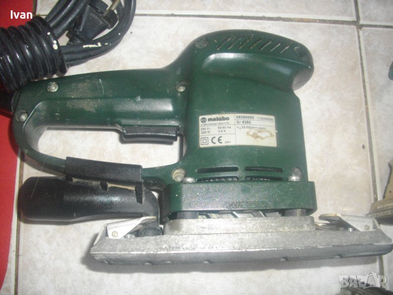 ОПИСАНИЕ на зелен прав виброшлайф 220 вата Метабо - 199 лв. Професионален прав/правоъгълен виброшлайф, 220 ватов модел на Метабо. Марка и модел на машината - Metabo Gr 4350. Производство - P.R.C. Машината е с много запазен външен вид и техн.състояние - ОТЛИЧНО. Работи много добре - силно, мощно, бързо и ефективно. Няма никакви забележки по техн.състояние.