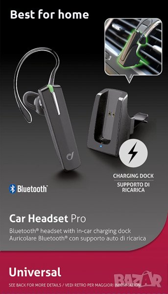 Bluetooth слушалки, предназначени за използване в кола. Има многофункционален бутон за отговор и удобна докинг станция за зареждане, която се прикрепя към вентилационните отвори на таблото.