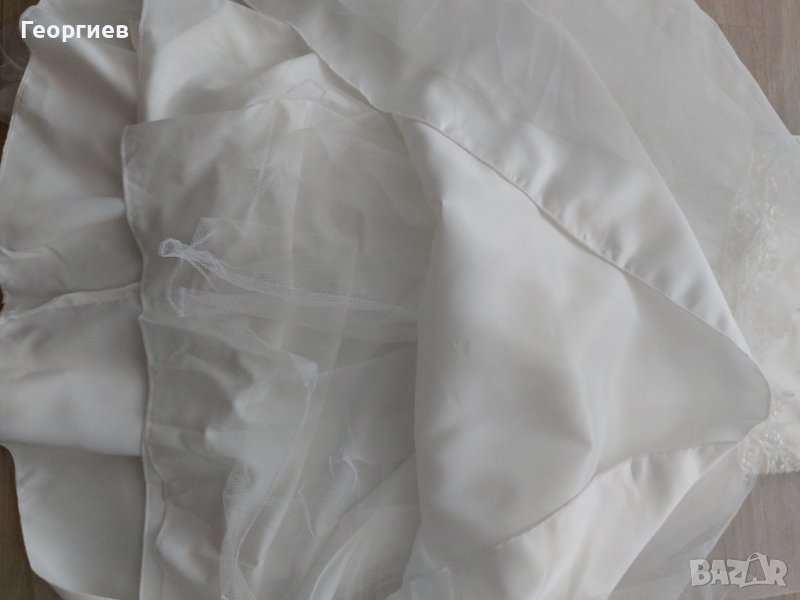 Красива шаферска рокля с тюл,сатен ,дантела,перли и цип на гърба.Тюла е три пласта отгоре,отдолу сатен и повдигащ пласт.На гърба с панделка.Дължина на роклята 100см,дължина на платката горе 32 см,ширина подмишници 38 см,ширина при дантелата 35см.