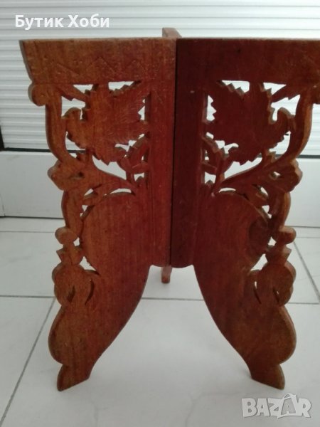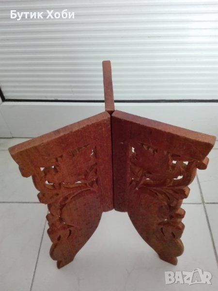 Поставка*основа с чудесна дърворезба. Състои се от три части, съединени с панти, сгъваема е. Височина - 31см; широчина - 11см.