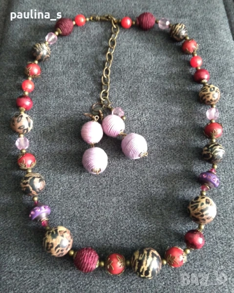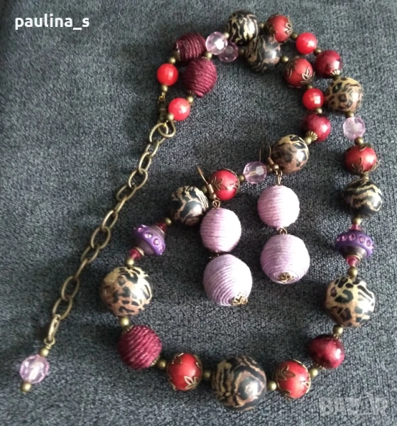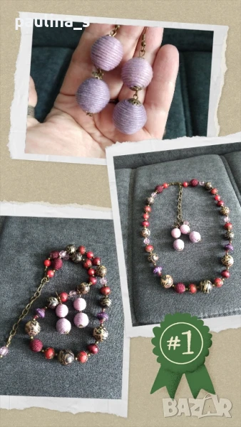 2️⃣. Колаж / "Express jewelry" Уникален комплект от маркови бижута с оксидация. Цената е крайна 39,99лв / 20 евро. Герданът е от различни по големина и форма мъниста, някои от бижутерска връв и оксидирани елементи. Обеците са на върбило, от лилави елементи с бижутерска връв. Мащабирането е на дланта.