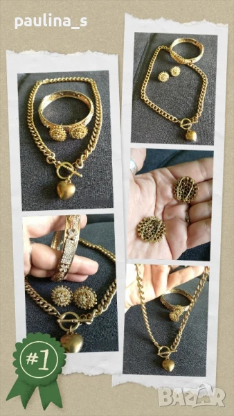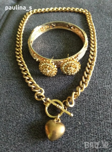 3️⃣. Комплект в златисто с камъни. Цената е крайна 29,99лв / 15 евро. Комплект от бижута в златисто, мисля че е медицинска стомана или бижутерска сплав. Колието е с О / Т закопчаване и сърце, дължина около 47см. Обеците са нови с клипс, но за дупки, с щифт, липсват им 2/3 камъчета! Гривната и колието са като нови, без дефекти. Цената е крайна и обща за всички артикули.