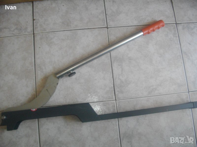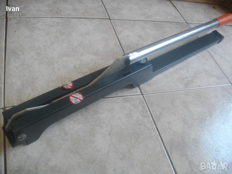 ОПИСАНИЕ на немска гилотина без основа - 139 лв. НАЛИЧНА. Лека и удобна за работа, с ерномични размери и олекотен дизайн. Съвсем нова голяма, масивна ръчна машина за рязане на ламиниран паркет. Работата посредством подобна машина е бърза, лесна, професионална и без запрашване на помещението, като срезовете са чисти, гладки и без нащърбвания.