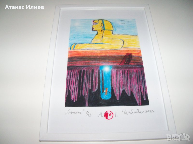 Картина "Сфинкс" на художника ЧерГарВан псевдоним на Атанас Илиев. Картината е тиражно изкуство, рисувана с акварелни моливи, сканирана и обработена на компютър, след което е отпечатана в 13 екземпляра на специална фотохартия 170гр. Картината е първи отпечатък от 13. Картината е подписана и датирана от автора и подпечатана с личния му печат. Размери с рамката 32х23 см.