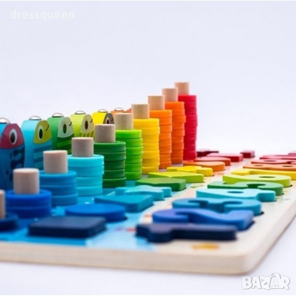 Дървена дъска с цифри, геометрични форми, низанка с рингове и магнитен риболов.