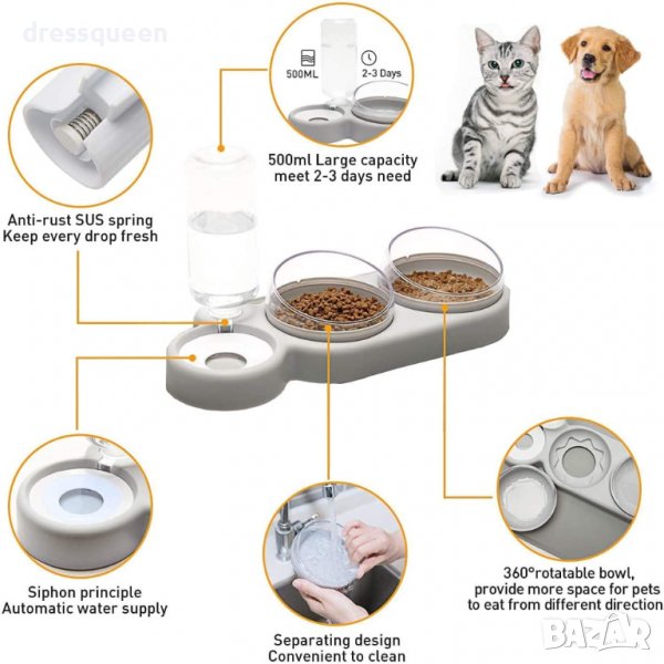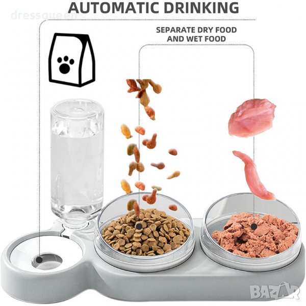 Двойна Поилка: Комбинира поилка за храна и поилка за вода, позволявайки на котката да се наслаждава на двете същевременно.