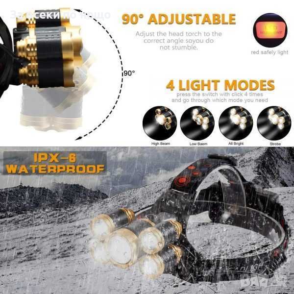 Супер мощен LED челник с акумулаторни батерии и 5 LED диода – идеален за къмпингуване, велосипедни спортове, туризъм, алпинизъм, спортно ходене, риболов, пътуване. Изключително полезен при ремонти в бита, за шофьори, при ветроходни спортове и т.н.