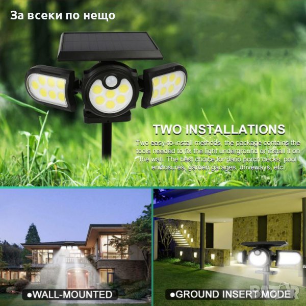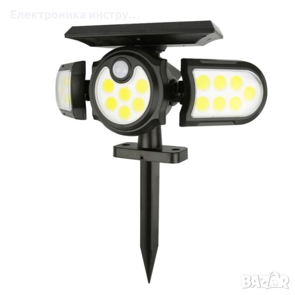 Регулируема лампа със соларен панел и сензор за движение, с помощта на която ще можете да осветите голям периметър. Лампата се презарежда от слънчевата светлина и използва запазената мощност за нощно осветление. С иновативния си дизайн лампата има широко регулируема осветителна зона, благодарение на трите глави, които можете лесно да местите по хоризонтала и вертикала за постигане на широк ъгъл на осветяване до 270°. Соларният панел и лампата са проектирани като едно тяло.