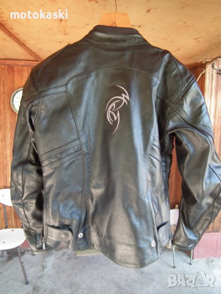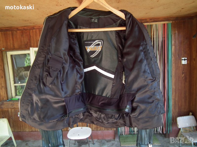Held кожено дамско яке за мотор, размер на етикета F46, UK 16, D 44, дължина отзад 64 см., обиколка около 112, гръб 49, ръкав отгоре 58 и отдолу 46, няма протектори, но има предвидени отвори на рамената и лактите, възможност за скачване с панталон, цена: 99 лв.