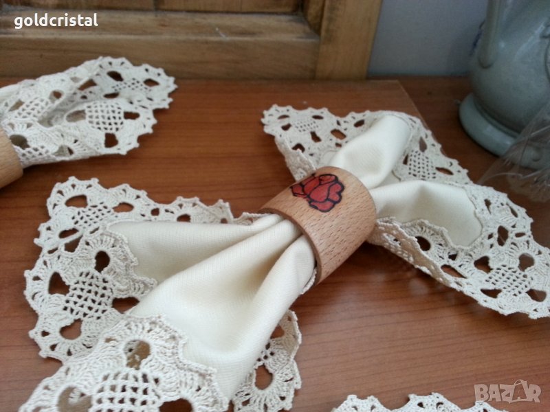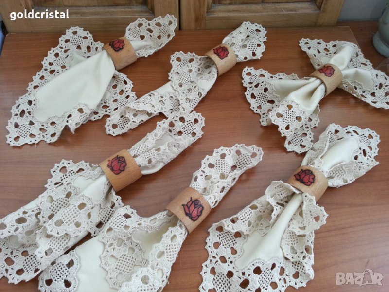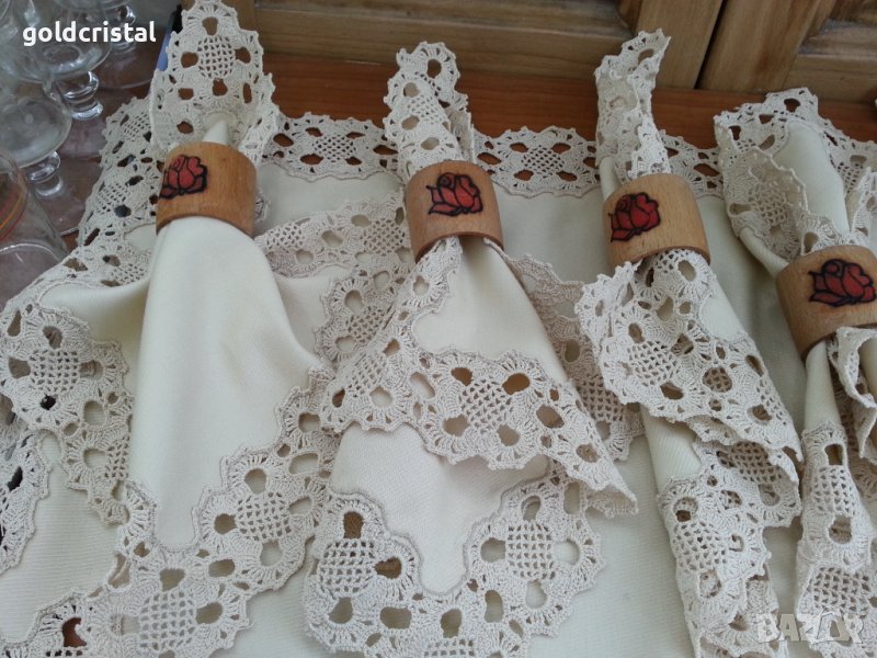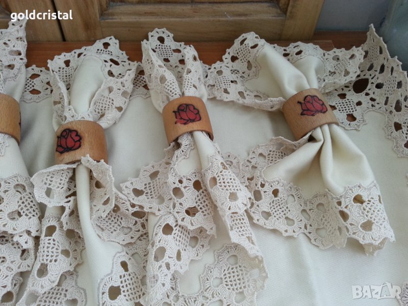 Комплект покривка за маса -45лв 6бр текстилни салфетки-120лв за маса ръчна изработка с дантела на една кука и 6бр дървени салфетници -24лв с гравирана роза от двете страни ретро арт декор винтидж колекция стари антикварни предмети обзавеждане за дома и семейството подходящи за подарък за ценители и колекционери