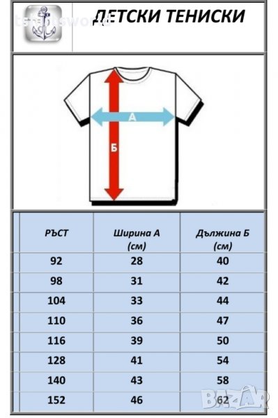 Таблица с размери в см е прикачена към снимките на продукта!!!