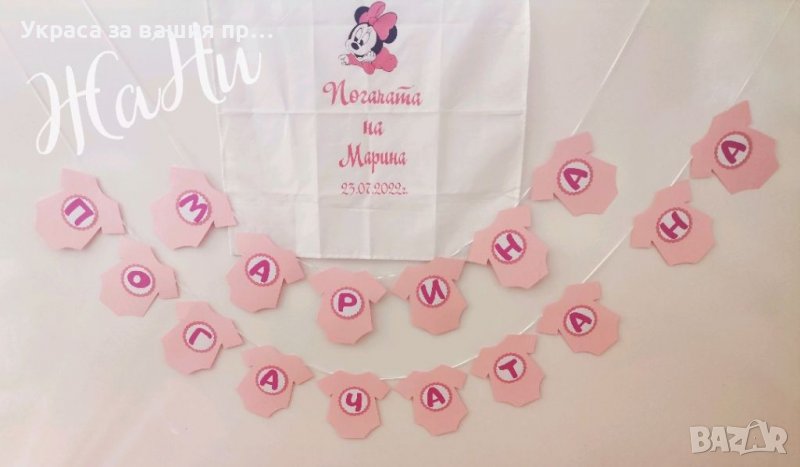 Украса За бебешка погача на тема Мини Маус *надпис *месал за разчупване на питката с името на детето → Обява 37497991