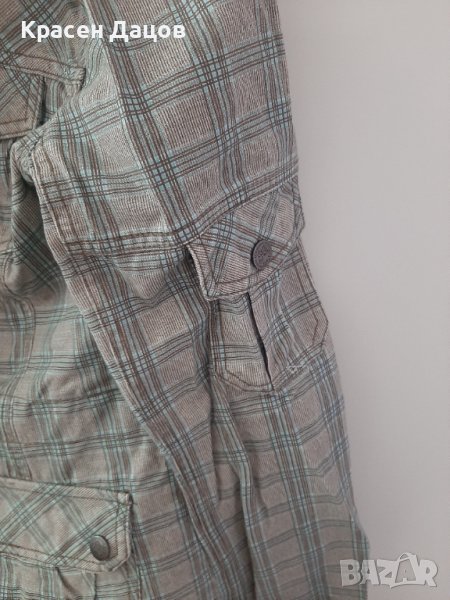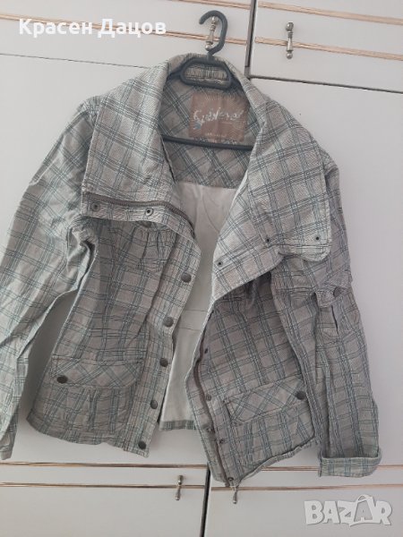 Дамско яке от плътен памучен плат с голяма шал яка,в пастелни тонове- мръсно бяло,бежово тънки кафеви и резедави линии.5 джоба-2 горе,2долу и 1 на ръкава,които се закопчават с копчета тик-так. Якето е с цип и копчета.по етикет е XL размер, но отговаря на L,затова го и продавам.обличано е 2 пъти, няма забележки.при интерес ще дам размери в сантиметри.